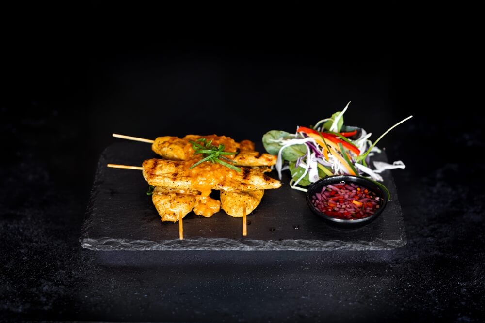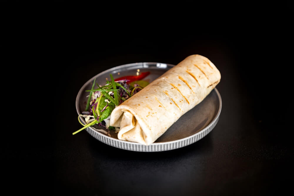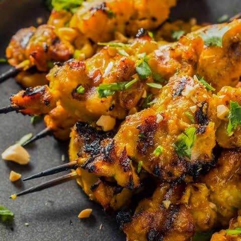 Grilled chicken or beef, shredded cabbage, cucumber, red onion, creamy Thai peanut satay with coconut and tamarind, topped with crushed roasted peanuts, wrapped in a warm roti.