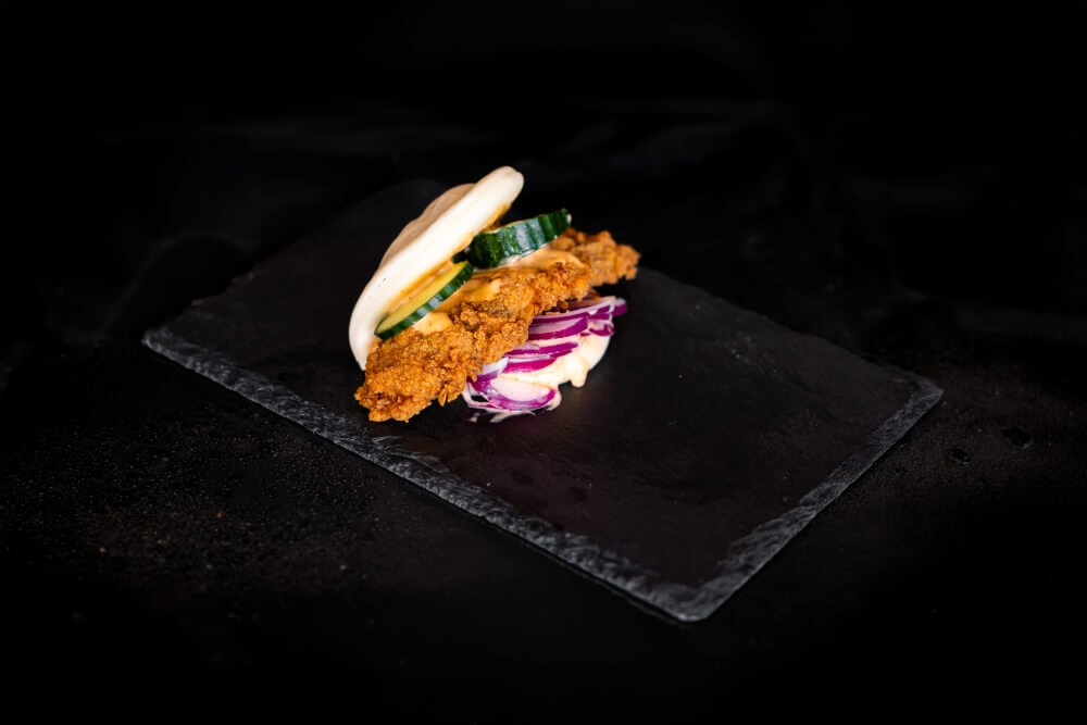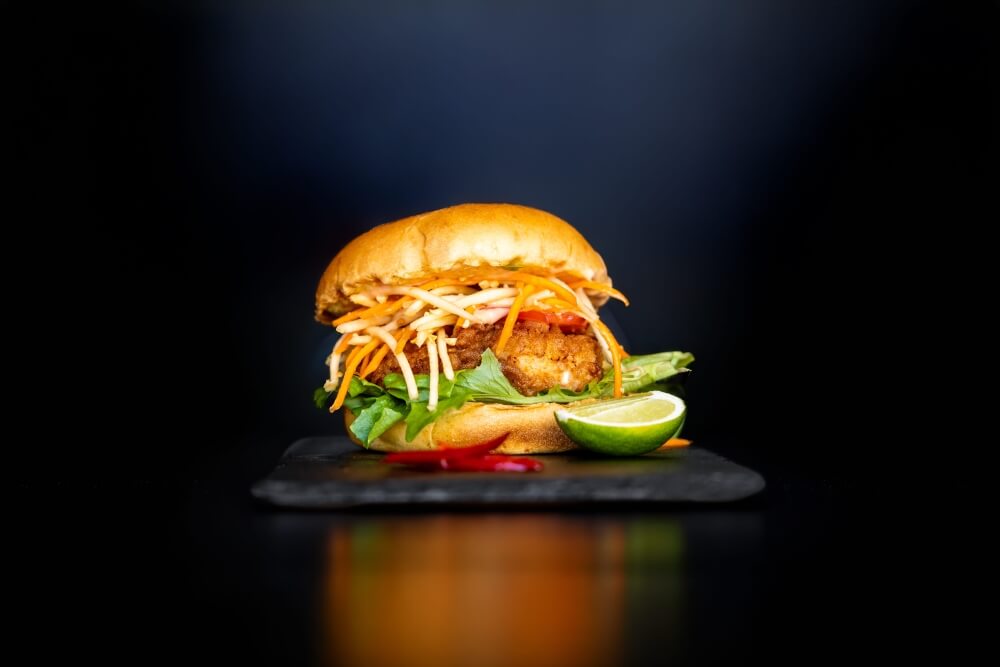 Crispy Spiced Chicken topped with sweet papaya salad and fresh lettuce on a soft bun. A tropical kick in every bite!