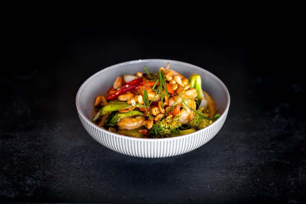 Stir fried fresh vegetables with your choice of protein in a rich sauce with a touch of mild roasted chilli paste