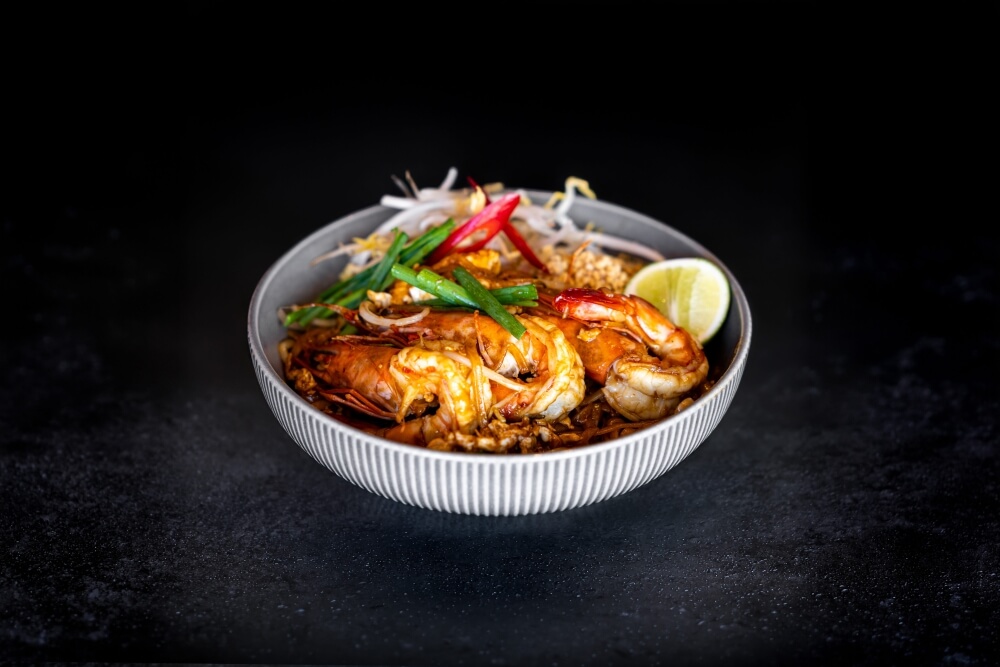 Our signature Pad Thai dish served with eggs, beansprouts, chives, and crushed peanuts.