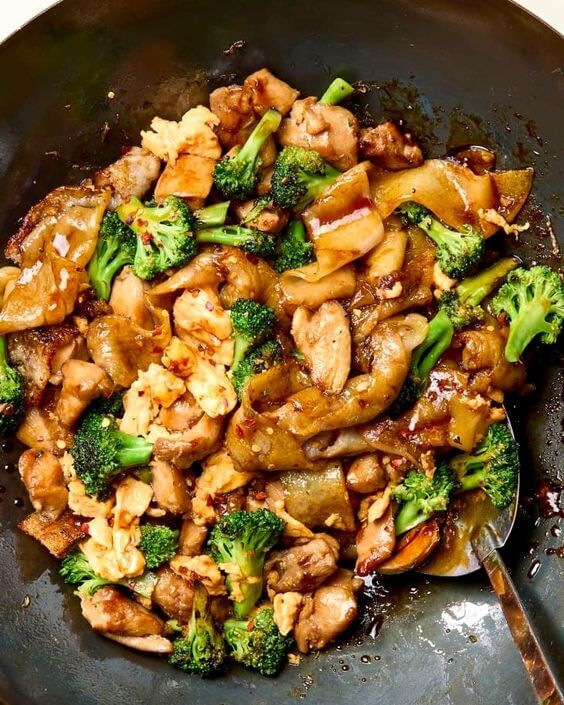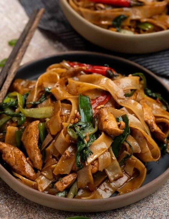 Stir fried flat rice noodles with fresh vegetables and your choice of protein.